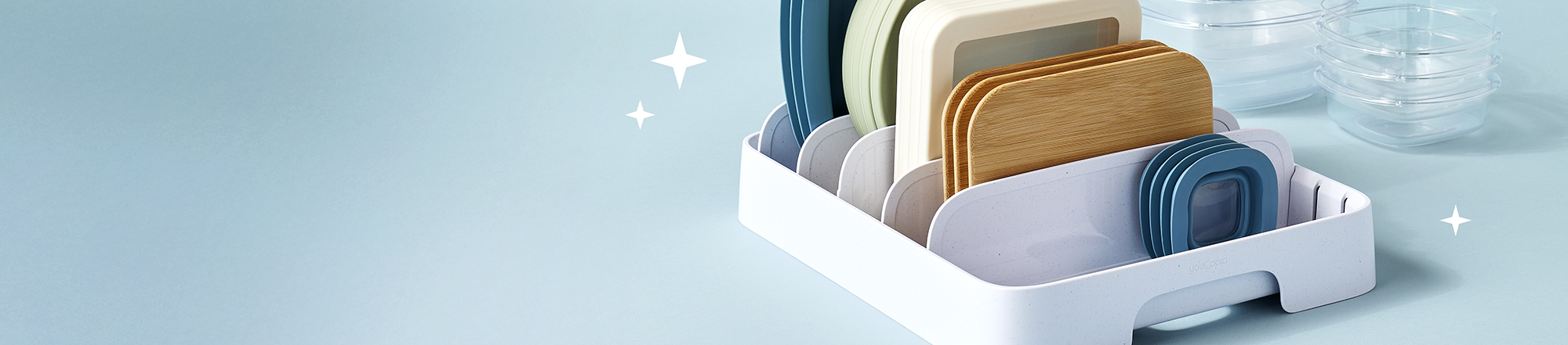 - Includes 8 adjustable dividers to keep lids upright in a tidy row