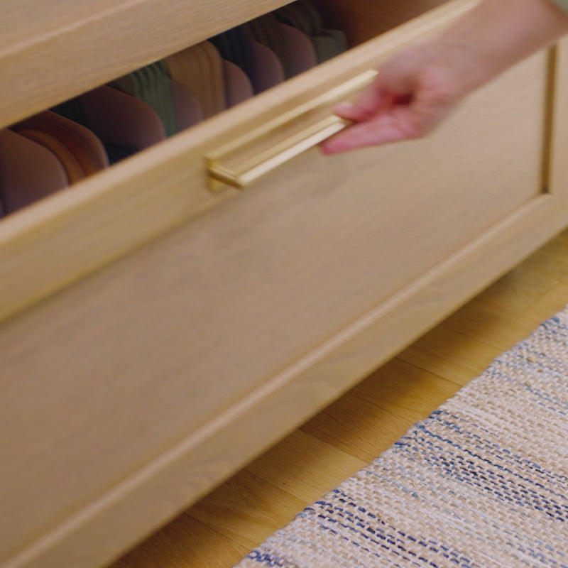 - Slides forward in a cabinet or lifts out of a drawer with built-in handles