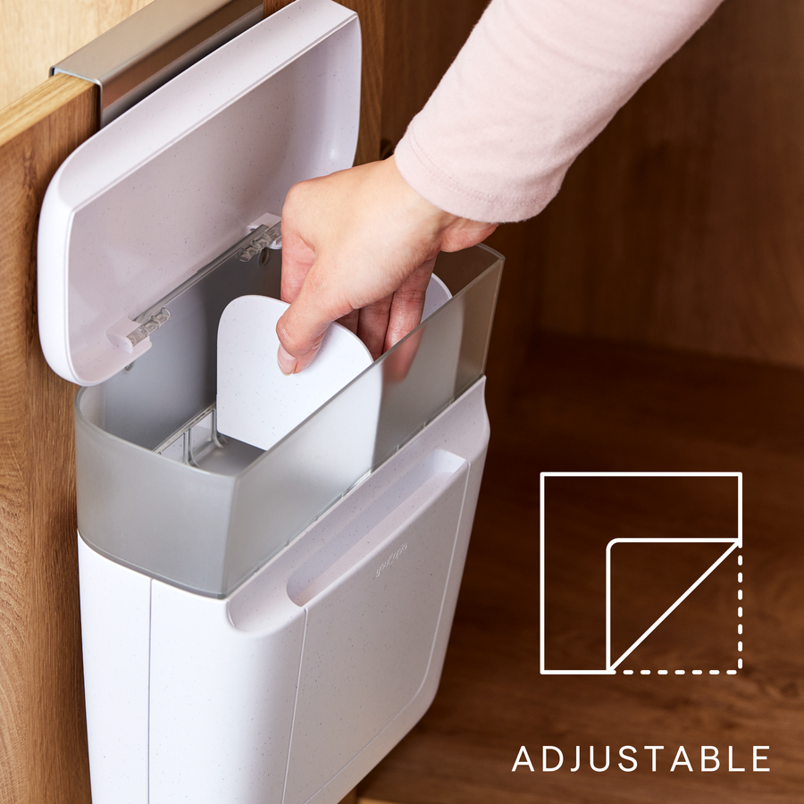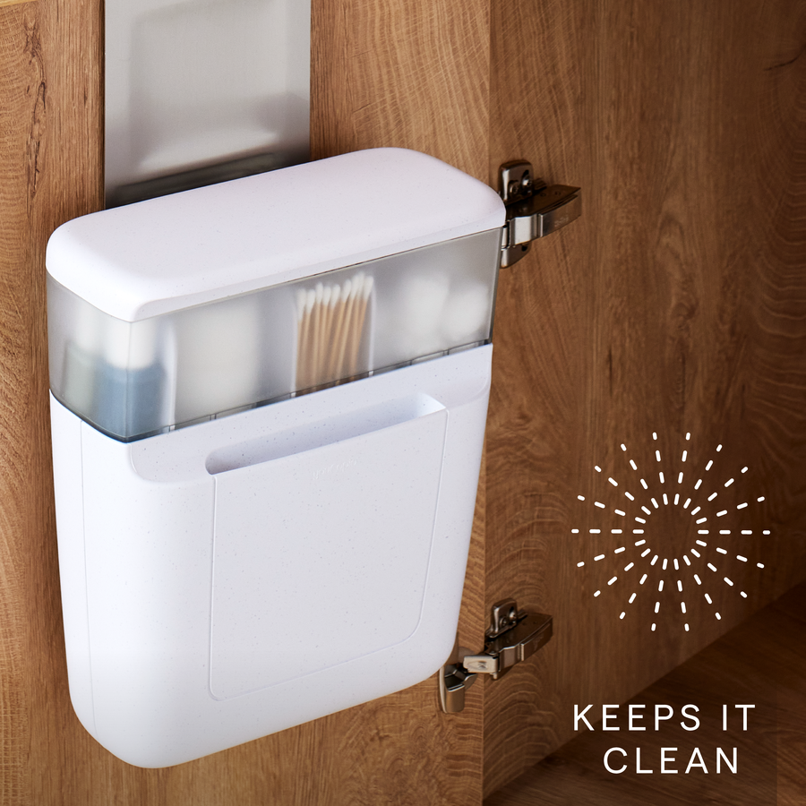 DoorStash™ Toiletry Organizer keeps personal care essentials out of sight yet within easy reach. It hangs on the back of a cabinet door with a padded, stainless-steel bracket. A top bin includes adjustable dividers to fit cotton swabs, hair ties and small bottles. A super-secret lower bin is ideal for stashing feminine care and grooming products. Covered storage protects daily routine items from germs and moisture. Bathroom clutter won’t get you down when toiletries are hung up in organized fashion.