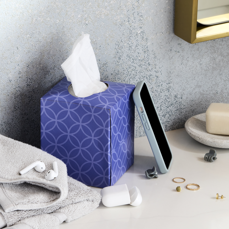 Ugly tissue boxes are a real tearjerker. We designed a clean cover that keeps tissues elevated, then added a top tray and padded ledge to hold more.
