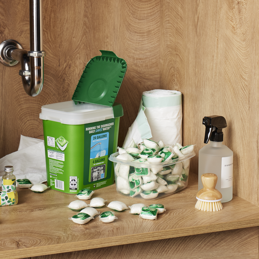 Designed to fit 100+ dish pods and a bulk roll of garbage bags