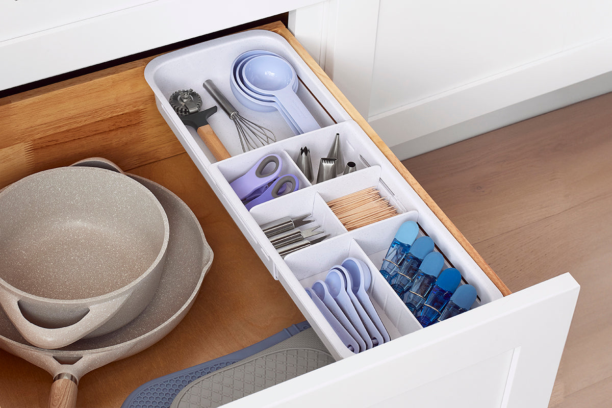 DrawerFit Sliding Drawer Tray adds a layer of organization to your drawer. It expands to fit (and sit) on drawer frames. A gentle push slides the tray across for access to items stored below. Adjustable dividers create compartments so everything fits. With an organized tray on top, your drawer will be a level up.