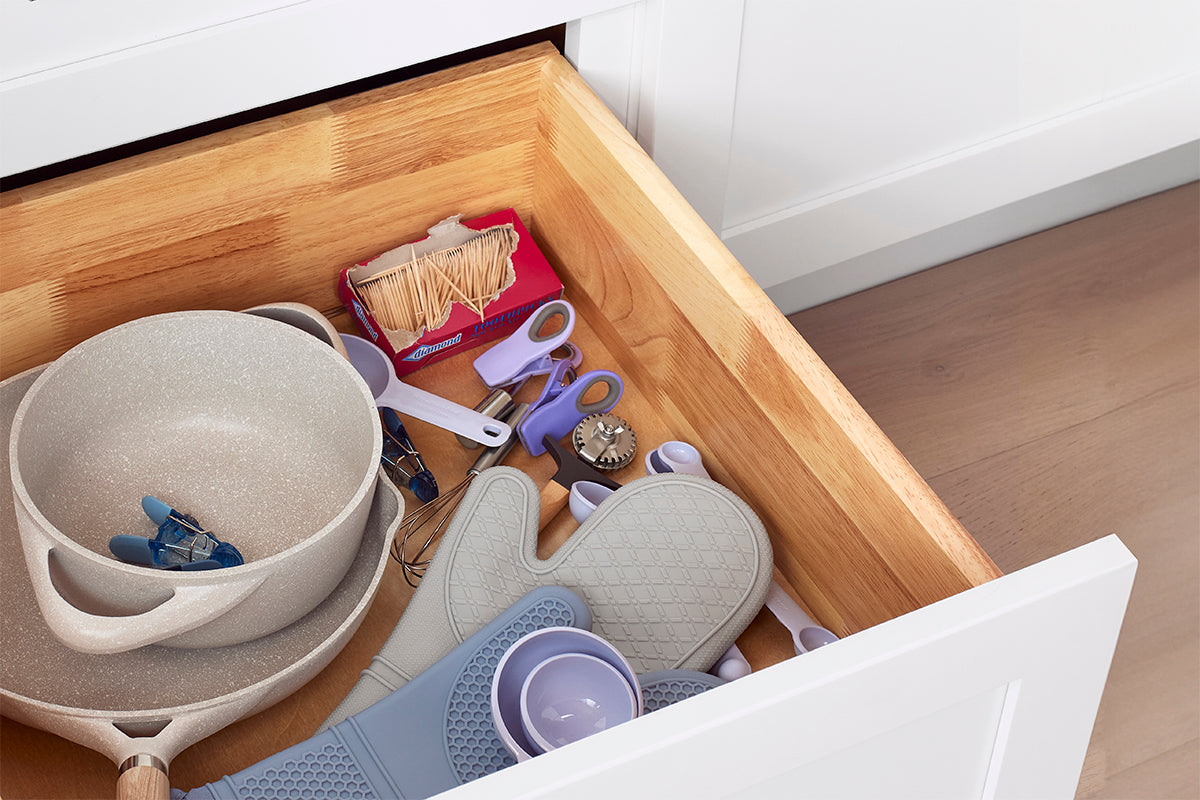 Deep drawers are notoriously hard to organize with all that vertical space. We created a shallow tray to sit on drawer frames so small items stay on top.
