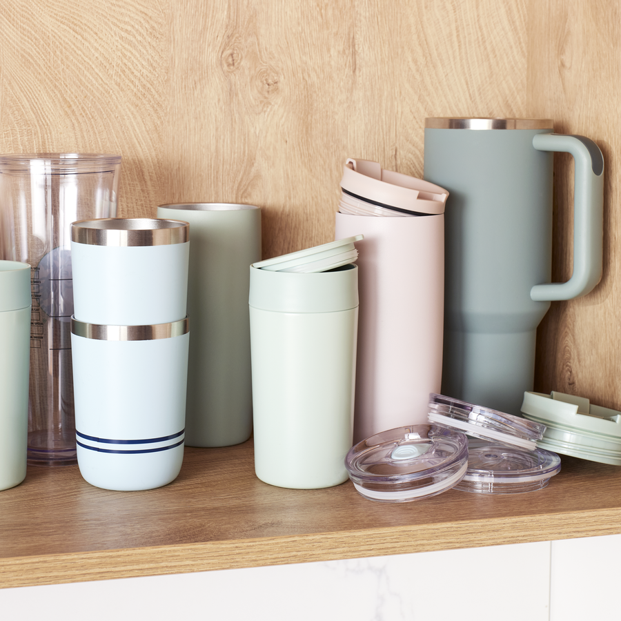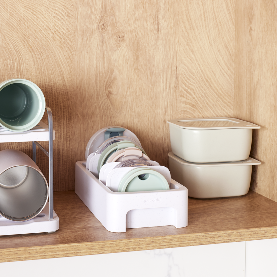 Most homes sport 8+ bottles, mugs and tumblers, which means a lot of parts and pieces! We designed a handy organizer to keep lids ready for game time.