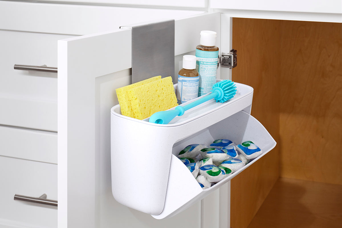 - Holds 50+ dishwasher pods in a flip-down bin that hangs over cabinet doors