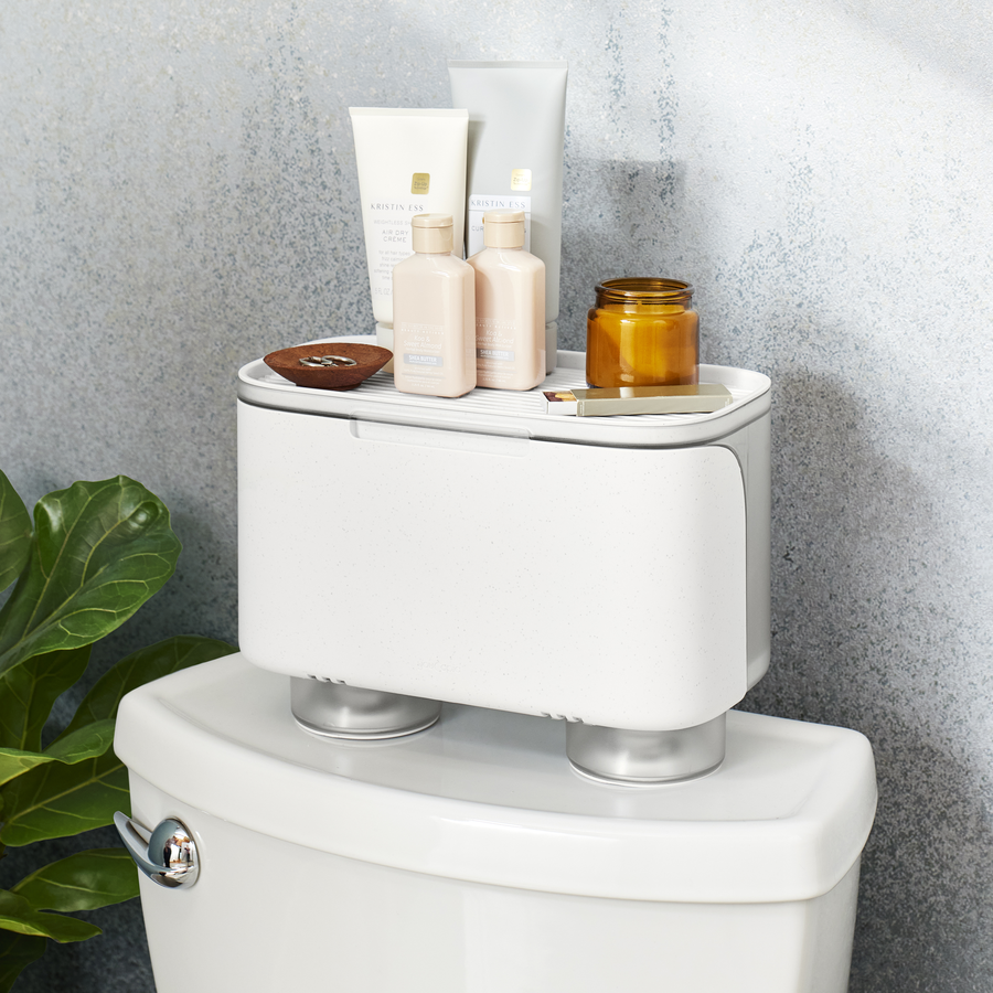 Hideaway® Toilet Cabinet adds extra storage to the top of your tank. Locking suction cups grip flat (non-curved) tank lids to keep the organizer in a steady spot. The wide front door opens to a hidden compartment built for two toilet paper rolls or private personal care products. An antimicrobial, removable top tray offers a tidy place for tissues, room spray, décor and more. With a cute toilet cabinet holding all your essentials, a fresh bathroom is in easy reach.