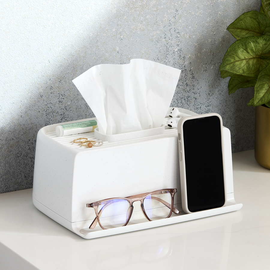 The Ledge™ Tissue Holder is more than just a sleek tissue box–it's multitasking magic. The full coverage lid and spring base keep boxes hidden while protecting against germs and moisture. A padded front ledge makes a nice phone prop. The top tray holds little extras like lip balm, earbuds and jewelry. With tissues and personal items organized, countertop clutter will disappear.