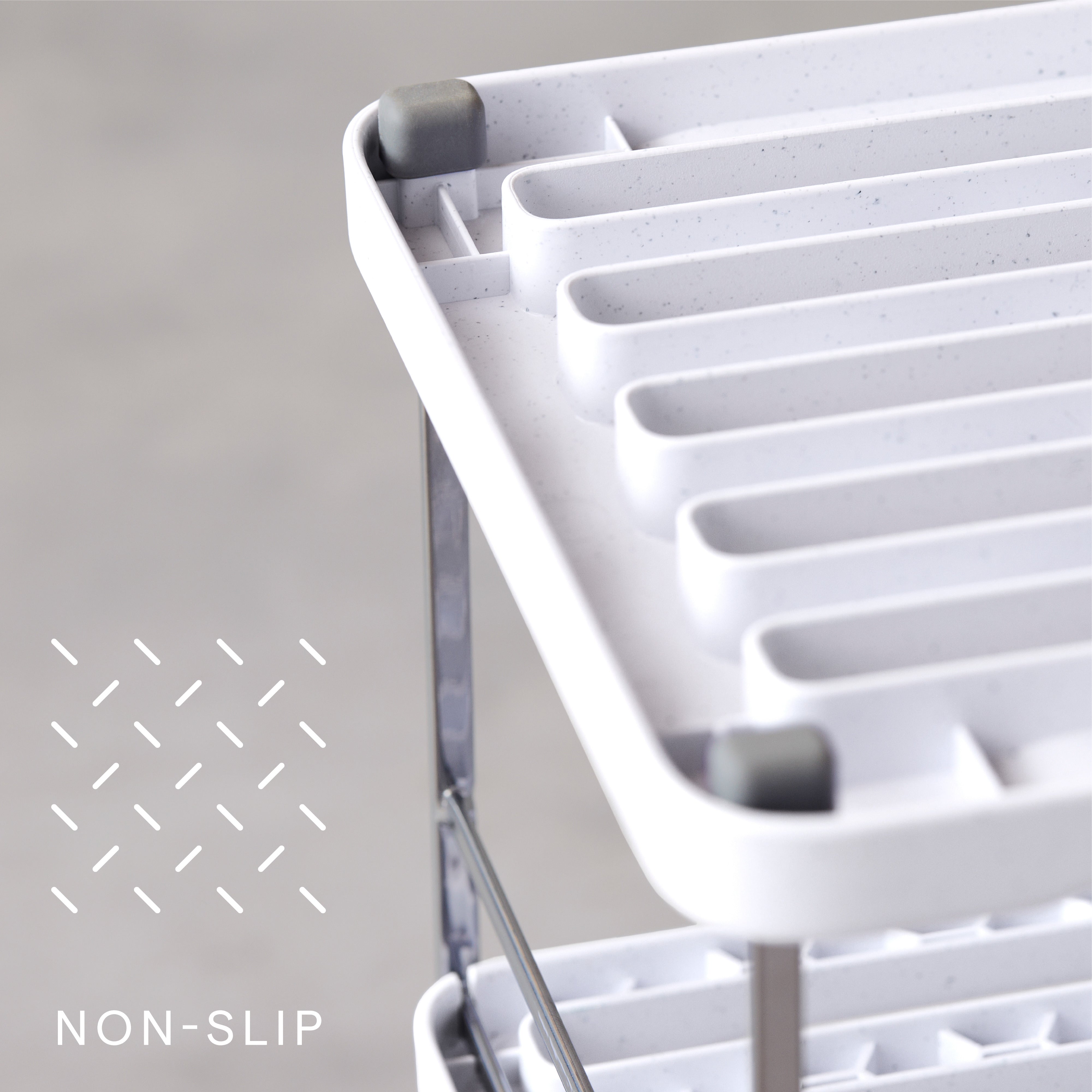 - Measures 7.2” D x 11.6” W x 11.7” H to fit standard cabinets; made with high-quality, BPA-free, recycled plastic and steel wires; speckled white color