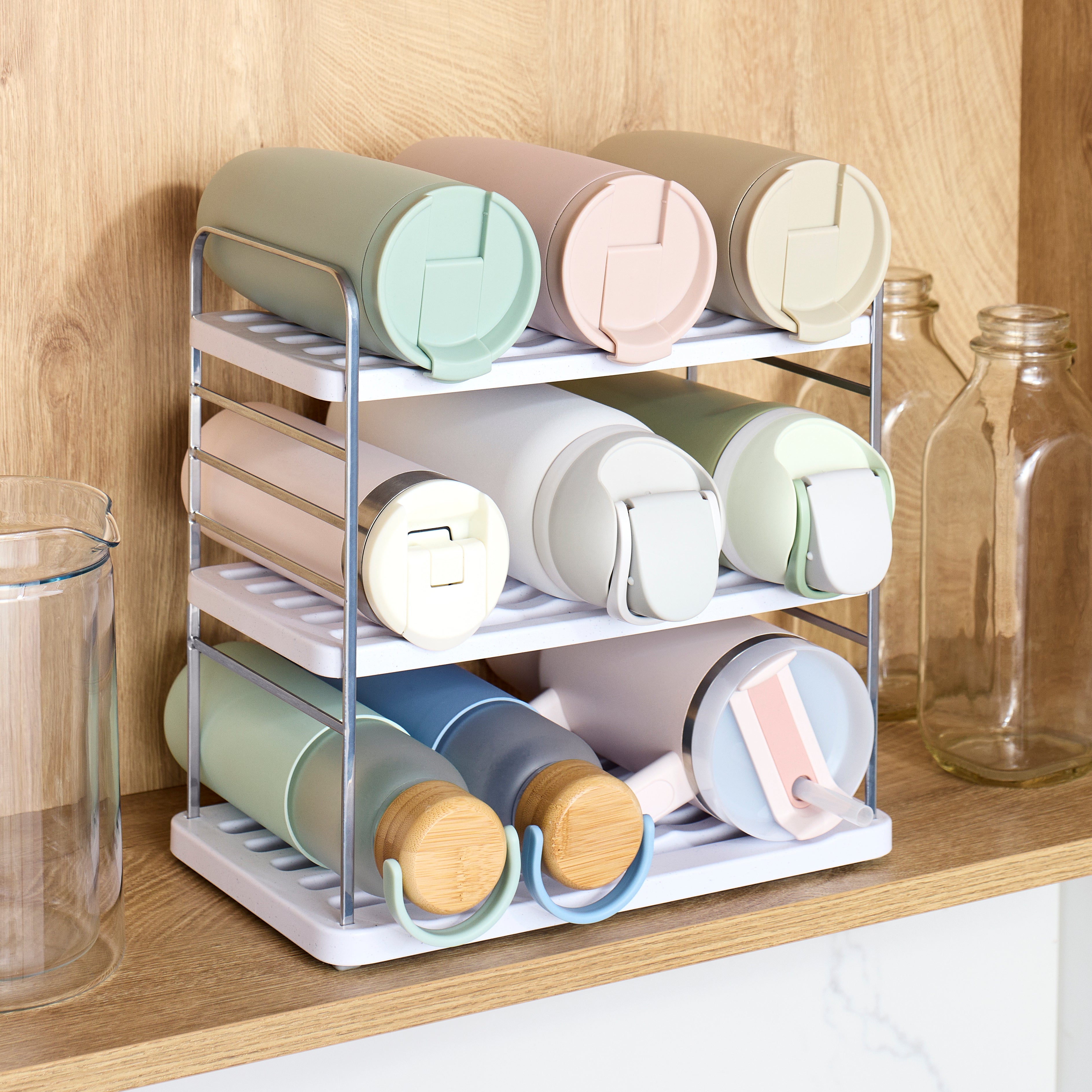 - Organizes glass and plastic water bottles, stainless steel and insulated travel mugs, oversize tumblers, kids’ sippy cups, sport bottles, baby bottles and more