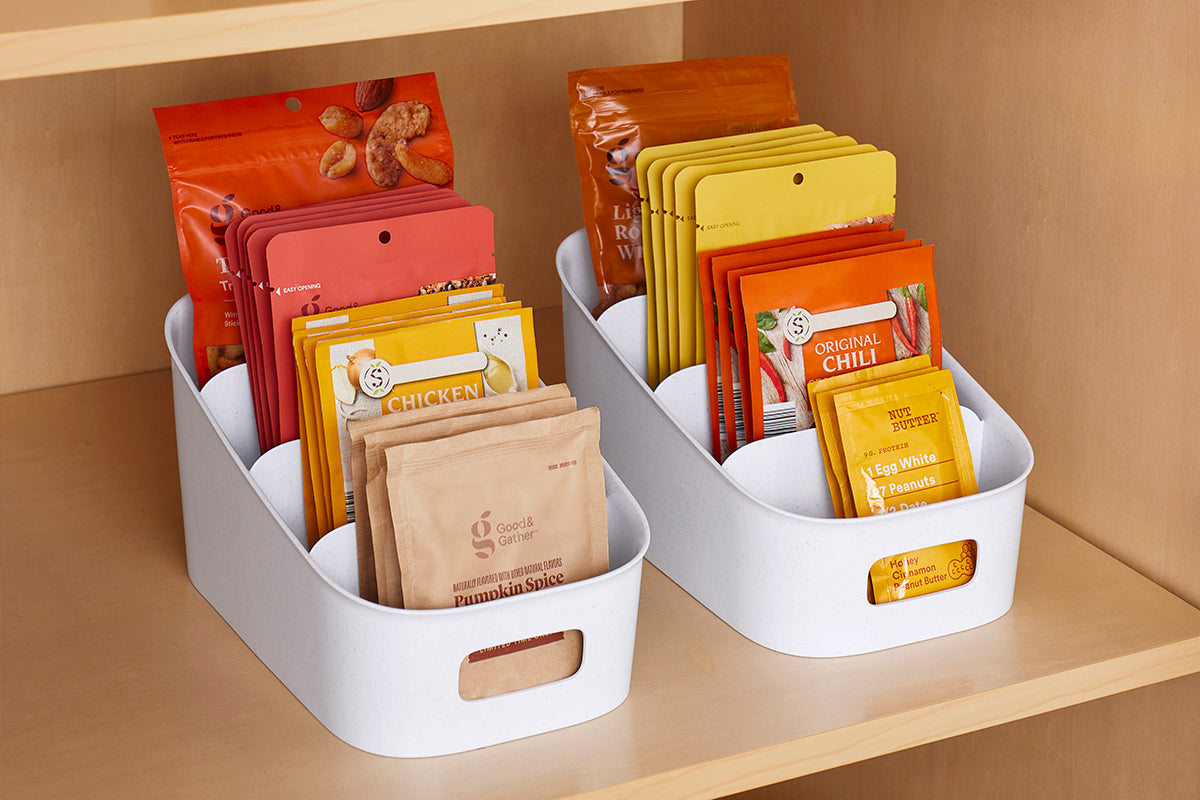 ShelfBin™ Packet Organizer has it all worked out with four compartments to stash small things - snacks, packets, seasonings and more - in a cabinet or pantry. Tiered storage and a handle makes it easy to see and grab what you’re looking for. With a bin this tidy, your organization will feel next-level.