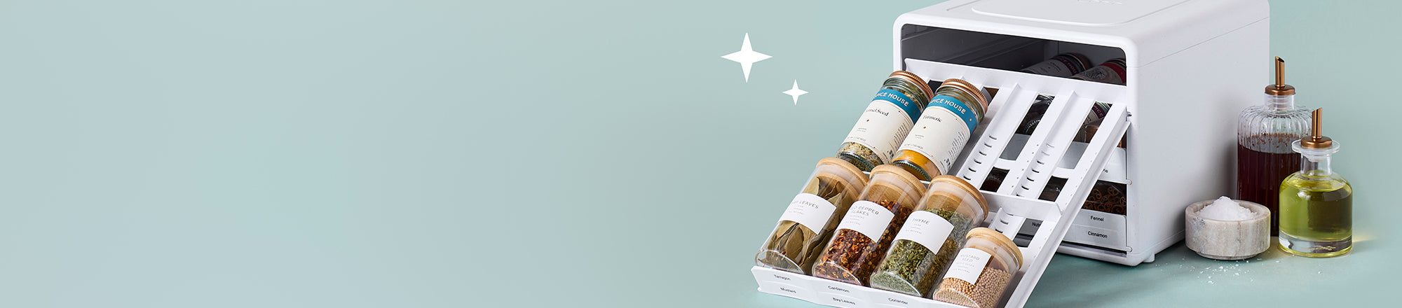 Jumbled spices mysteriously multiply with time. Our drop-down cabinet rack was the first of its kind to keep spice bottles tidy and accessible.