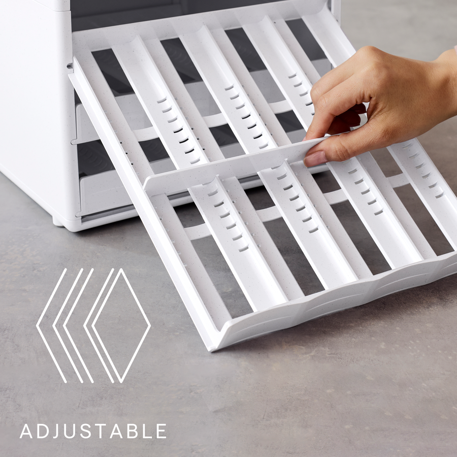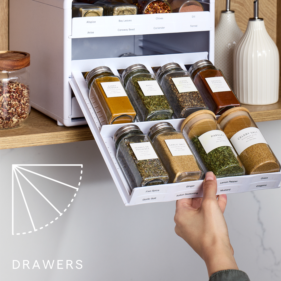 Jumbled spices mysteriously multiply with time. Our drop-down cabinet rack was the first of its kind to keep spice bottles tidy and accessible.