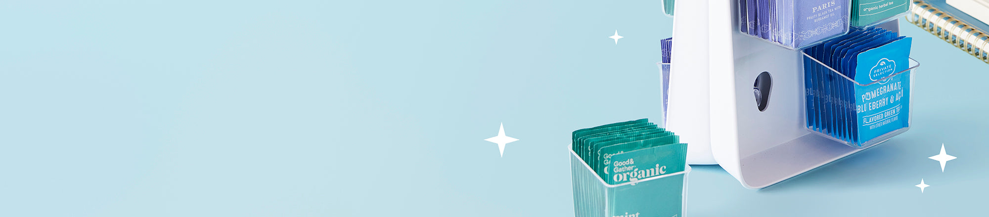 - Organizes 80+ tea bags in a slim space.