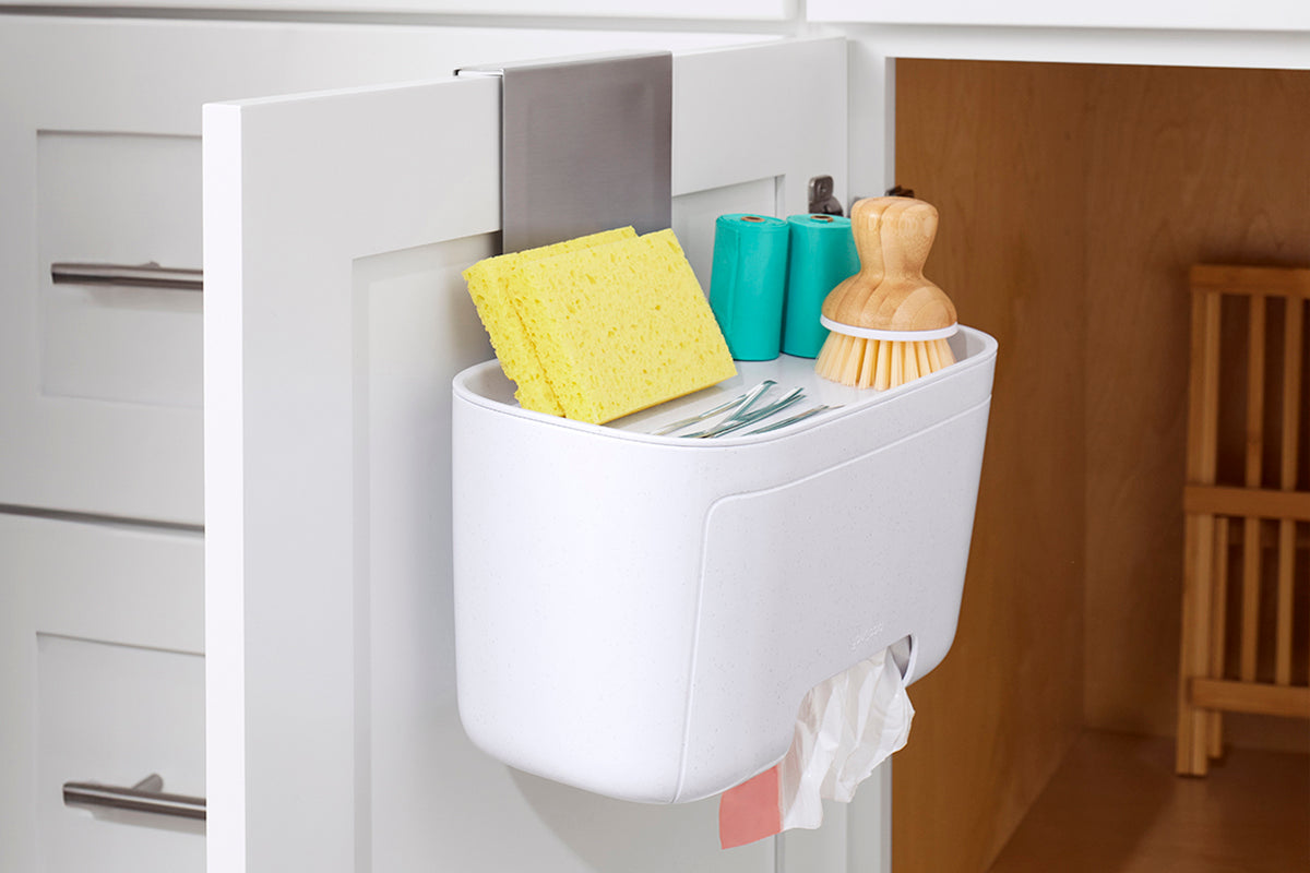 DoorStash Garbage Bag Dispenser puts the “ta-da” in your trash routine. Bulky boxes disappear with bags hiding in a convenient, over-door location. Trash bag rolls load quickly into the holder with a removable top lid. A wide front opening dispenses bags like magic. When you can open the cabinet and pull a fresh bag, clean-up is an easy act.
