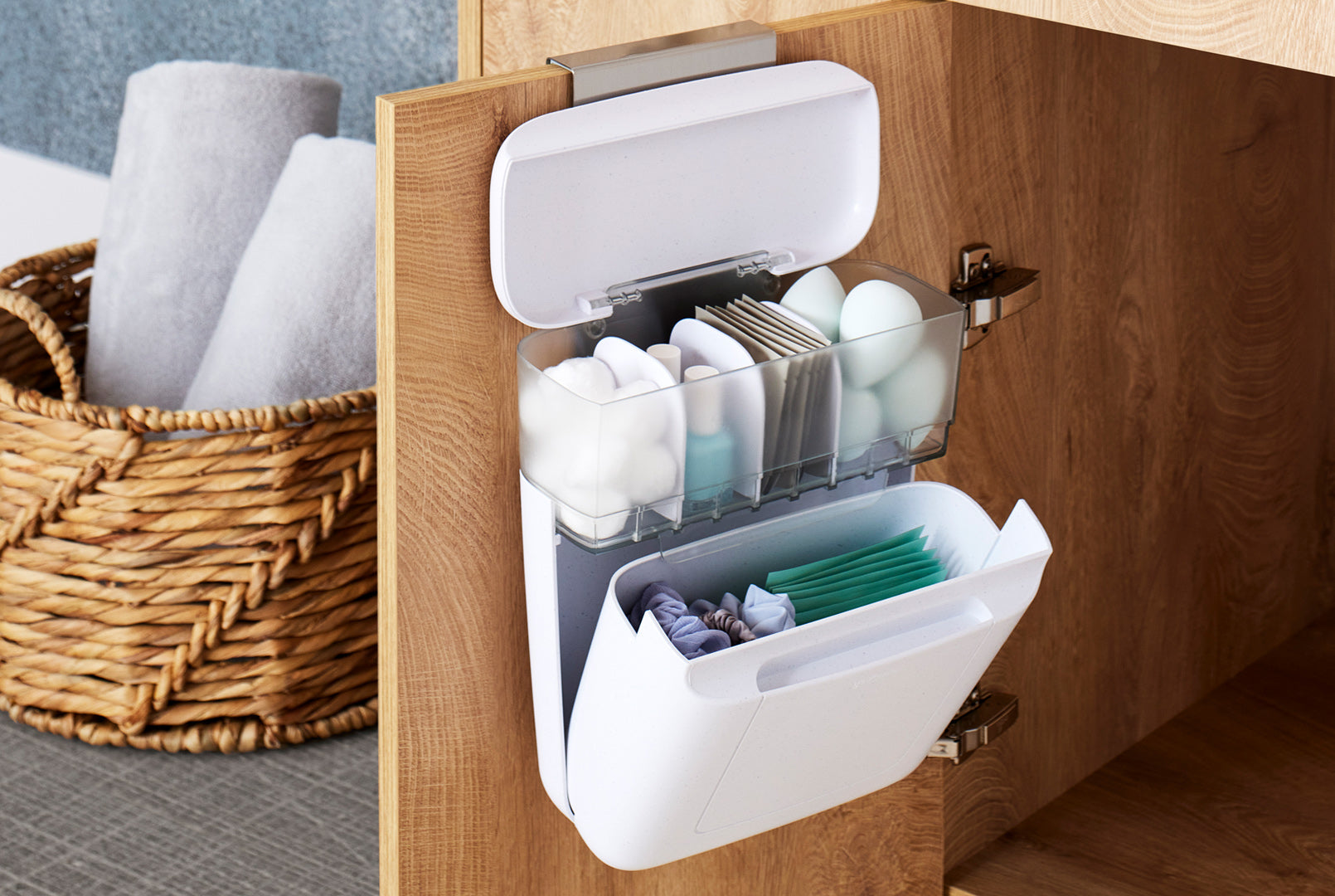 DoorStash™ Toiletry Organizer keeps personal care essentials out of sight yet within easy reach. It hangs on the back of a cabinet door with a padded, stainless-steel bracket. A top bin includes adjustable dividers to fit cotton swabs, hair ties and small bottles. A super-secret lower bin is ideal for stashing feminine care and grooming products. Covered storage protects daily routine items from germs and moisture. Bathroom clutter won’t get you down when toiletries are hung up in organized fashion.