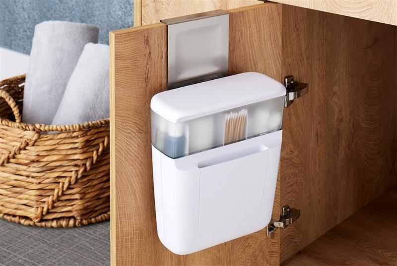 DoorStash™ Toiletry Organizer keeps personal care essentials out of sight yet within easy reach. It hangs on the back of a cabinet door with a padded, stainless-steel bracket. A top bin includes adjustable dividers to fit cotton swabs, hair ties and small bottles. A super-secret lower bin is ideal for stashing feminine care and grooming products. Covered storage protects daily routine items from germs and moisture. Bathroom clutter won’t get you down when toiletries are hung up in organized fashion.