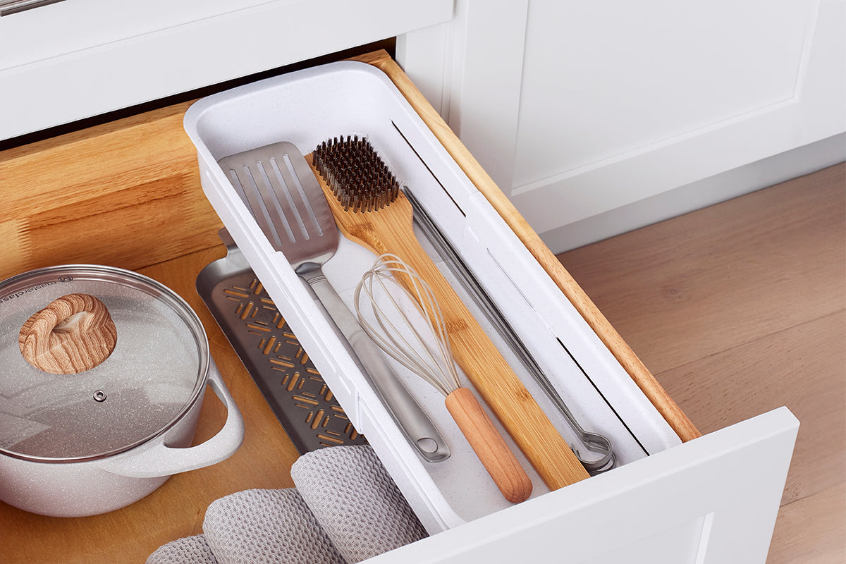 DrawerFit Sliding Drawer Bin adds a layer of organization to your deep drawer. It’s a clever solution for kitchen gadgets, grill tools, serving utensils, towels and more. The bin expands to fit (and sit) on drawer frames. A gentle push slides the bin across for access to items stored below. With an organized bin on top, your drawer will be a level up.