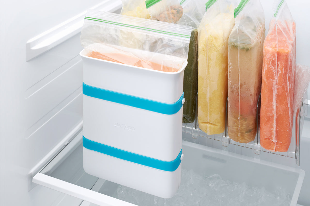 Ice trays freeze baby-size portions, but we needed a solution for family-size meals. Our vertical molds freeze bags in clean, space-saving blocks.