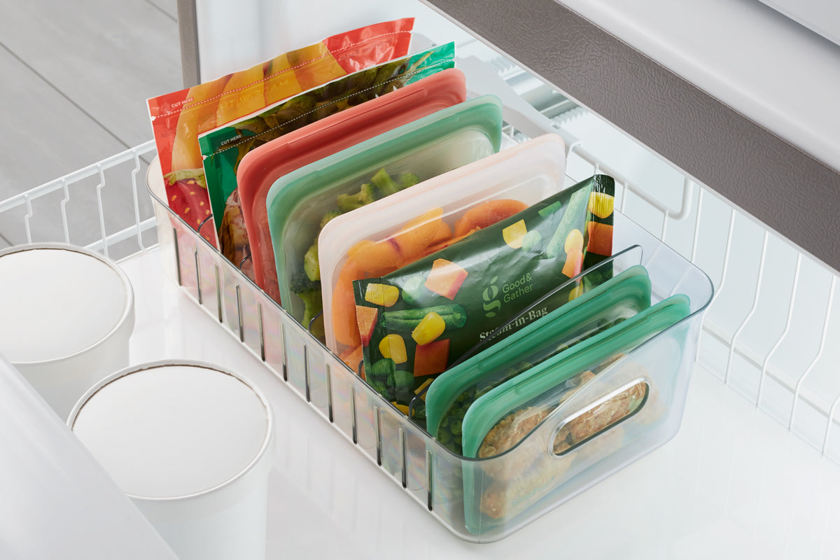 FreezeUp® Freezer Bin makes frozen food easy to find because you don’t have time for an arctic expedition before dinner. Adjustable dividers keep frozen food bags in tidy order, while handles help you slide the bin out for royal selection. When your freezer is organized, you rule the ice kingdom.