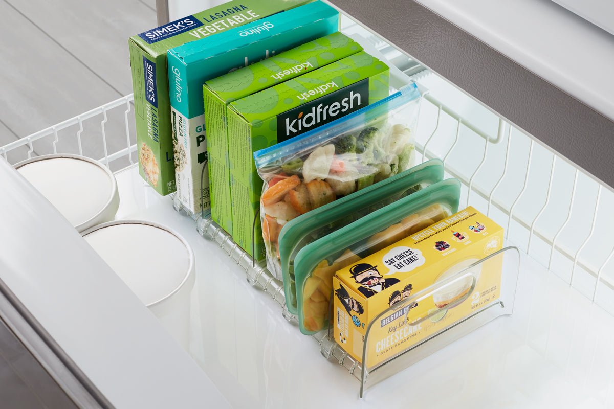 FreezeUp® Freezer Rack won’t let food expire under an icy mountain stack. Adjustable dividers hold frozen food boxes vertically for clear visibility and quick selection. Handles help you slide the rack out to reach items in the back. When your freezer is organized, an easy meal is downhill from there.