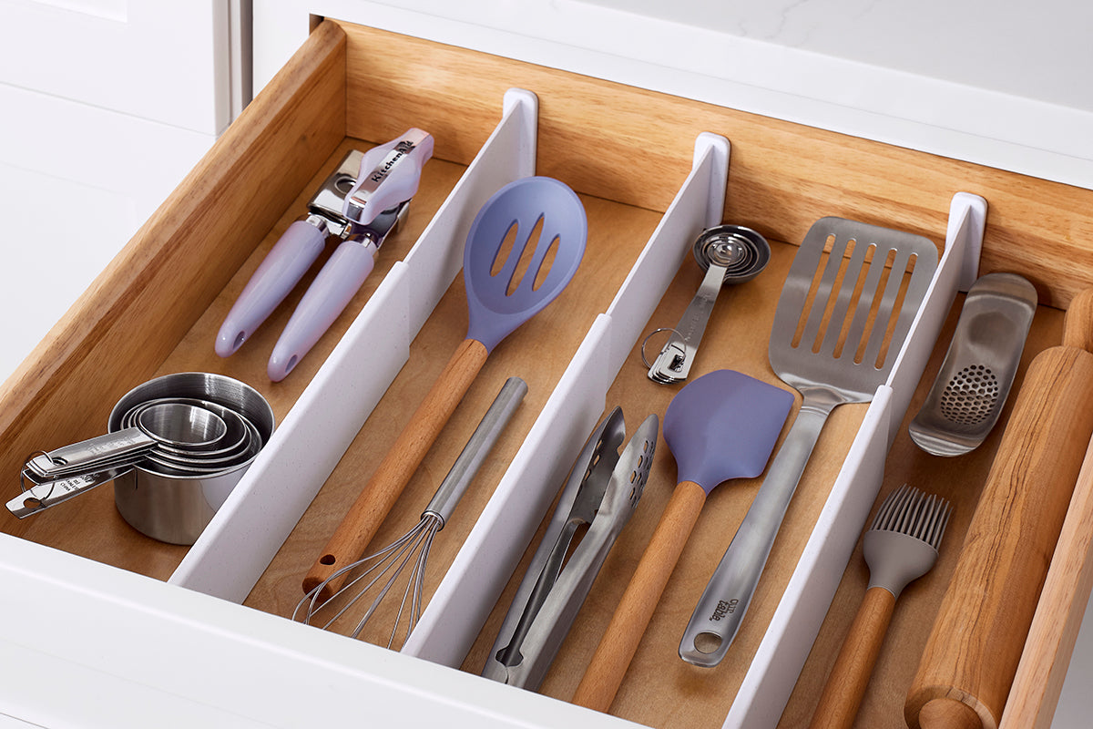 - Three drawer dividers easily expand up to 24” to fit drawers horizontally or vertically