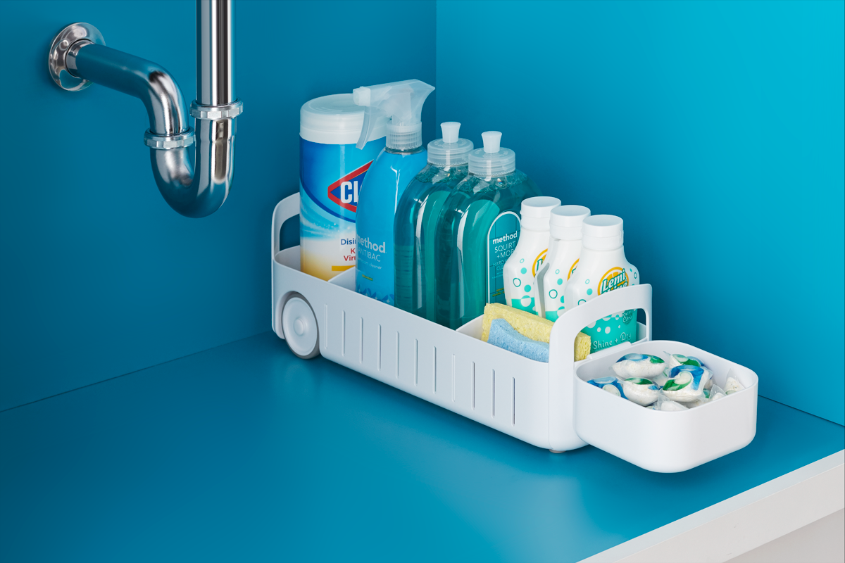 Under sinks are disorganized dark zones! Our compact caddy has wheels, dividers and a basket to shed light on items and keep cleaning routines easy.