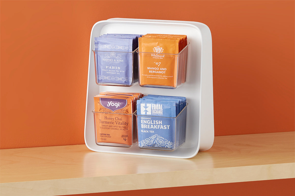 Teatime should be “me time" but box clutter made us boil. Our tea caddy displays labels through clear, bins worthy of endless pinky-up moments.